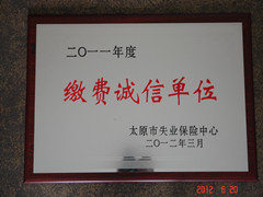 2012年6月20日,2012年6月20日,我公司獲得由太原市失業(yè)保險中心頒發(fā)的 "二0一一年度繳費誠信單位"榮譽稱號。
